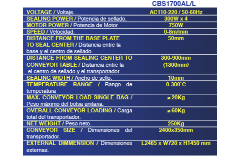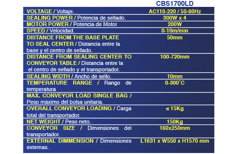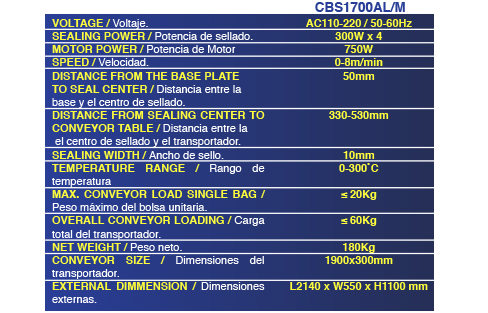 La serie de máquinas CBS1700 trabaja con dos sets de bloques de sellado para poder sellar todo tipo de bolsas laminadas. Es usada para sellar bolsas o sacos entre 5Kg y 20Kg, dependiendo del modelo.