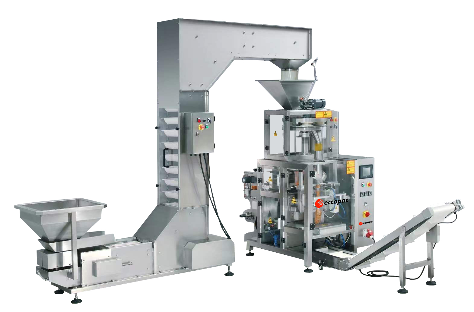 • Se puede conectar con un dosificador de balanzas multicabezal, balanzas lineal, la taza telescópica volumétrica, dosificador de azúcar u otro equipo de dosificación para formar una línea de envasado automática.