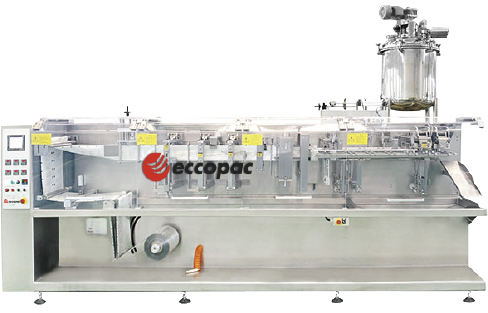 Máquina Envasadora AutomÁtica Horizontal marca ECCOPAC, especialmente diseñada para envasar bolsas autoestables tipo doypack desde la lámina. Puede adoptar dosificadores de peso, líquidos o polvos por volumen como proceso de llenado de pouch.