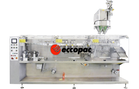 Máquina Envasadora Automática Horizontal marca ECCOPAC, especialmente diseñada para envasar sachets de 3 o 4 sellos desde la lámina con Sello Hermético Zipper. Puede adoptar dosificadores de peso, líquidos o polvos por volumen como proceso de llenado de pouch.